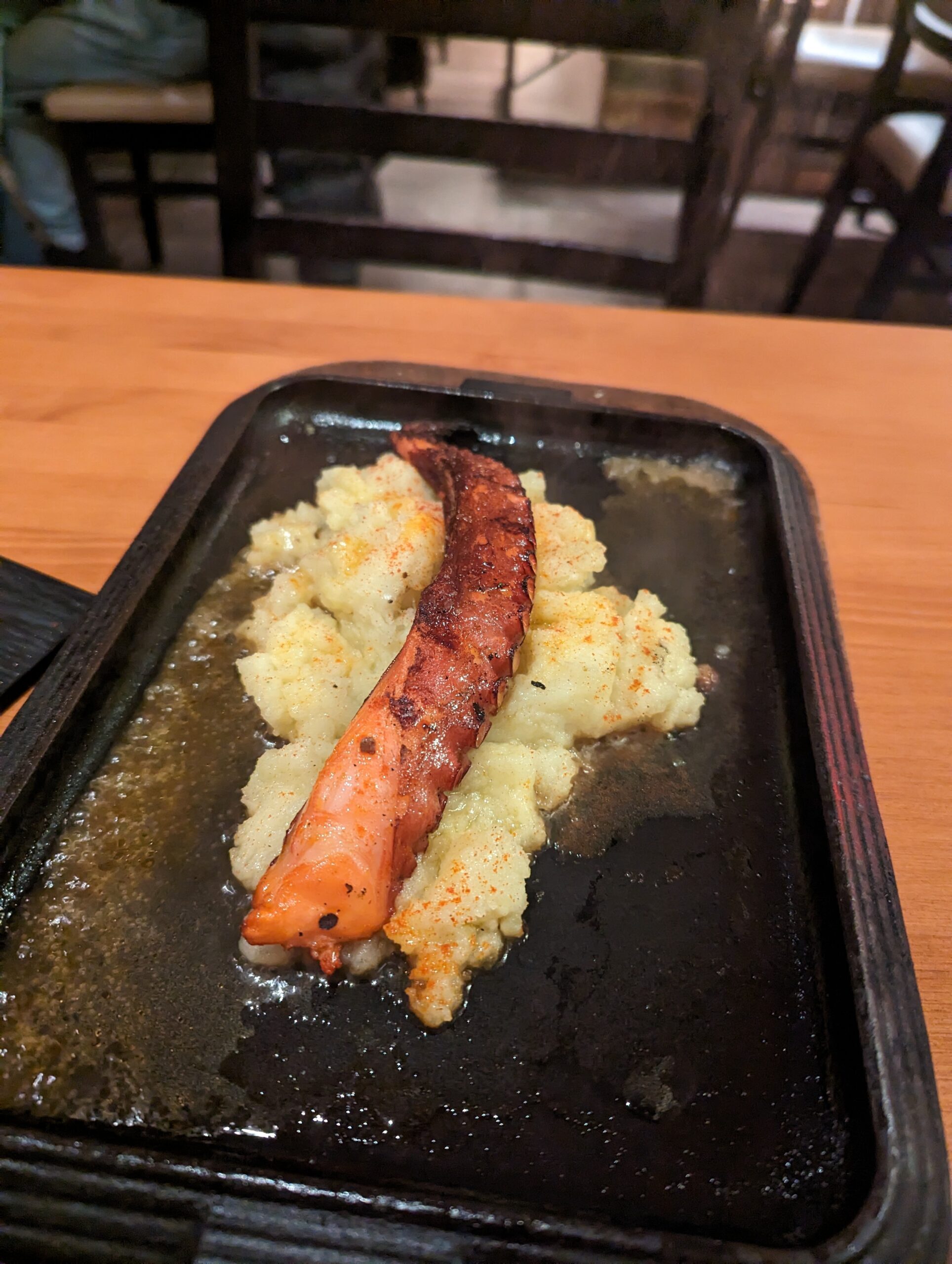- Pulpo a la brasa con puré de patatas flameado con coñac – The octopus was smoky and charred to perfection, served in flames at the table. The cognac added a warm, aromatic note that made the whole dish feel dramatic and indulgent. Each bite was a mix of smoky, tender, and slightly sweet flavors, making it one of the most memorable things I ate.