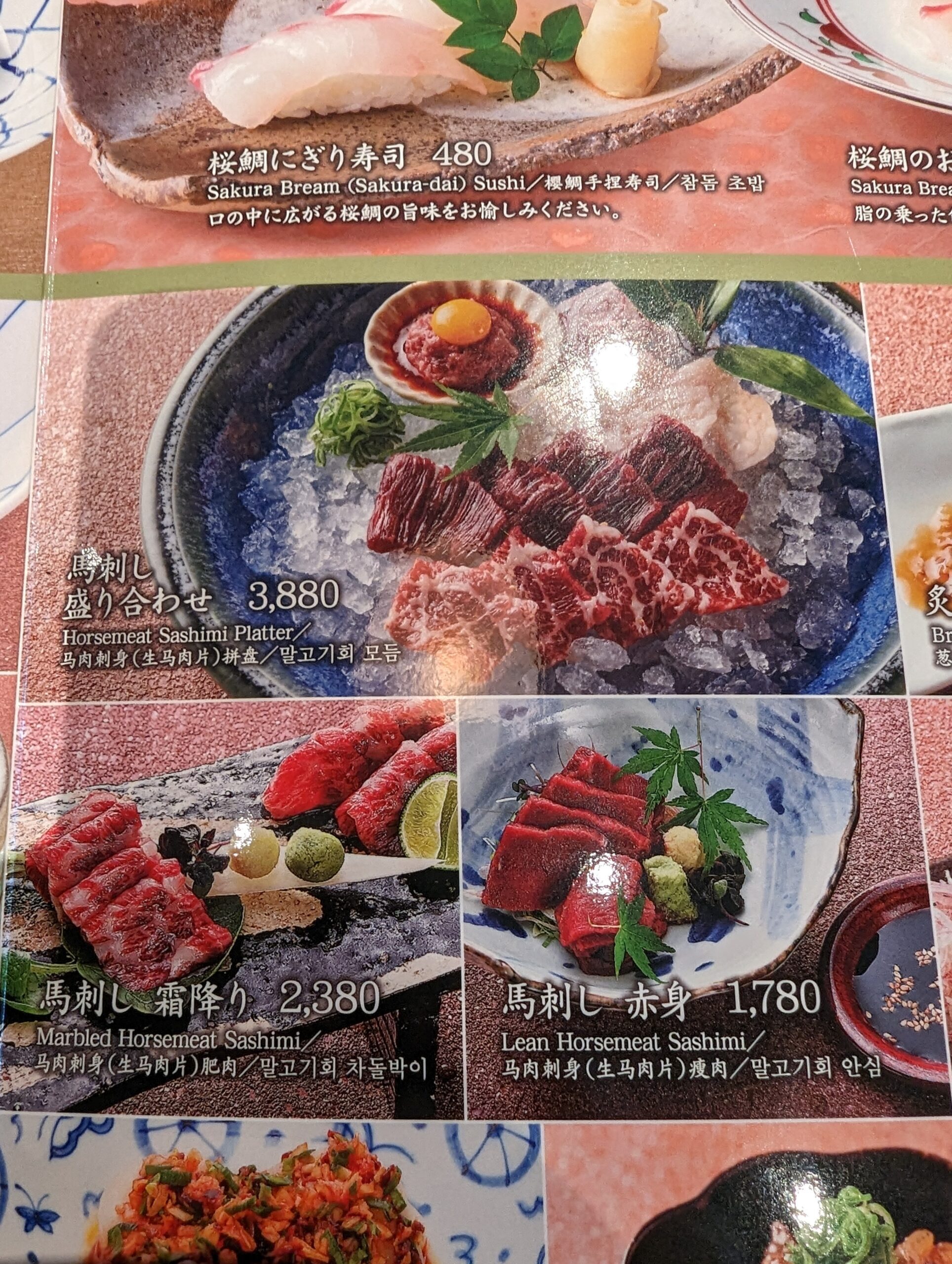 Where Marugame feels quick and casual, Tsurutontan feels refined. They’re best known for their enormous ceramic bowls and a menu that balances tradition with playful twists. On one visit in 2023, the seasonal special was basashi (馬刺し), sashimi made from raw horse meat. When I returned in spring 2025, the focus had shifted to a sakura-themed menu featuring red sea bream (桜鯛).